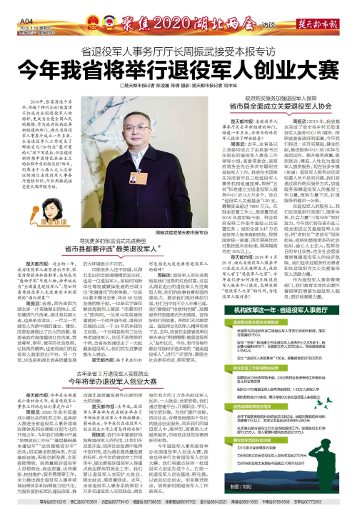 1月18日,《楚天都市报》04版以《今年我省将举行退役军人创业大赛》为题,全文刊发省退役军人事务厅党组书记、厅长周振武的专访。