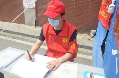 (图为电台村社区服务队队员张晨做进出人员记录)
