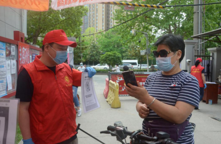 (图为党员沈皓提醒进入社区人员扫健康码)