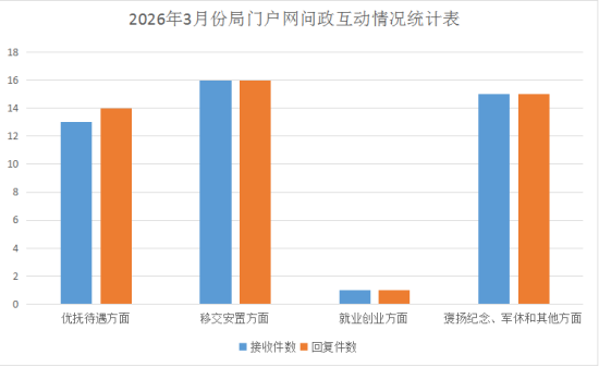2026年3月份,市、区退役军人事务部门认真学习贯彻中央、省、市关于退役军人信访稳定工作的有关文件精神和要求,不断深化思想认识,畅通信访渠道,加大困难帮扶,强化积案化解,坚持把退役军人信访稳定工作当作重中之重来抓,有力的维护了我市社会大局的稳定。市退役军人事务局在门户网与网民互动基本情况如下: